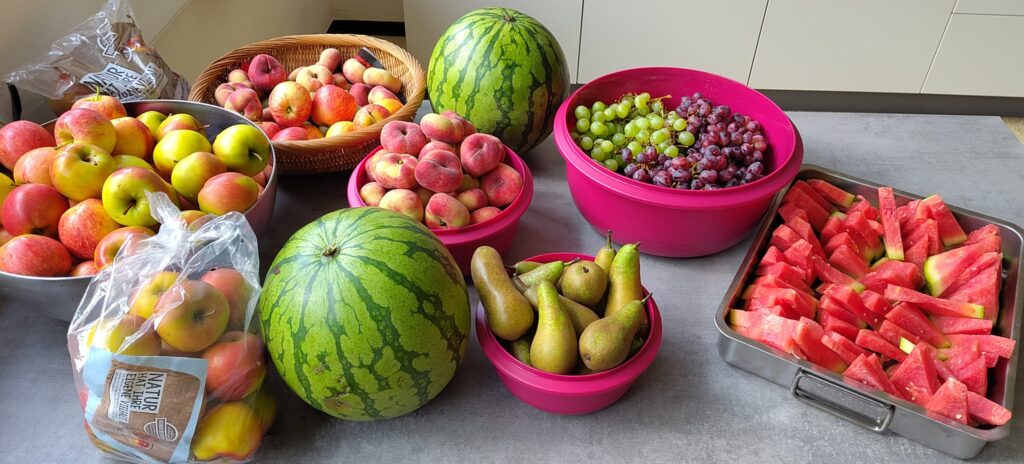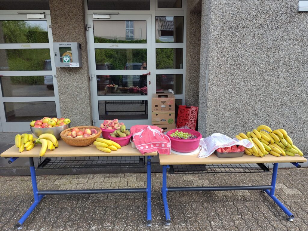 Unter dem Motto „Fabrikzucker hat schulfrei“ verteilte Nina Knippen vom Förderverein zusammen mit engagierten Eltern verschiedene Obstsorten wie Äpfel, Bananen, Trauben, Pflaumen und Melonenstücke – insgesamt 76 Kilo allesamt mundgerecht vorbereitet und in appetitlicher Form präsentiert. Die fruchtige Erfrischung fand großen Anklang bei den kleinen Sportlerinnen und Sportlern.